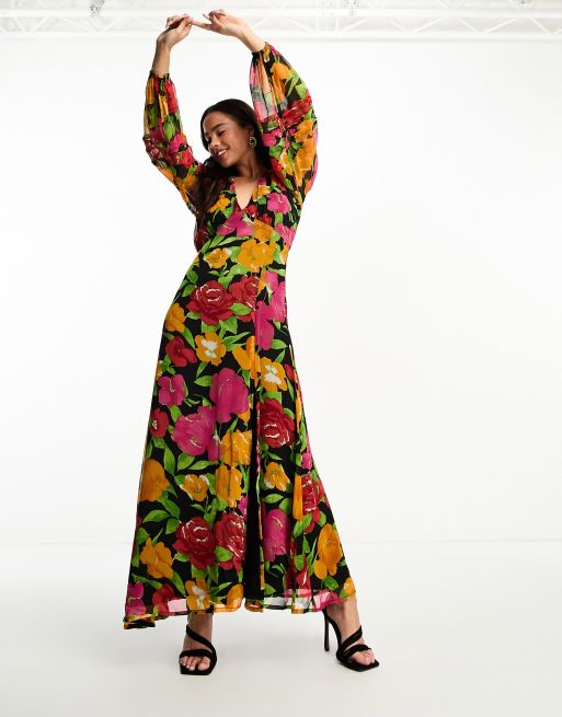 Floral print v neck long sleeve on sale maxi dress