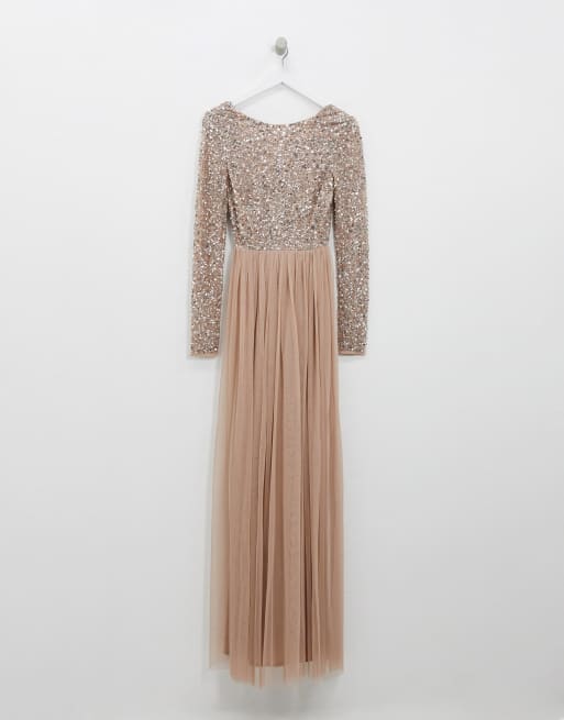 Product Item: Maya bridesmaid long sleeve maxi tulle dress on sale with tonal delicate sequins in taupe blush